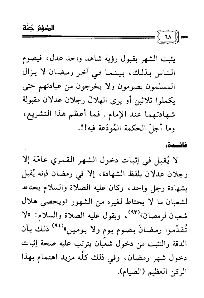 لا يُقبل في إثبات دخول الشهر القمري عامّة إلا رجلان عدلان بلفظ الشهادة، إلا في رمضان فإنه يُقبل بشهادة رجل واحد، وكان عليه الصلاة والسلام يحتاط لشعبان ما لا يحتاط لغيره من الشهور «ويحصي هلال شعبان لرمضان» (¬93) ، ويقول عليه الصلاة والسلام: «لا تُقدِّموا رمضانَ بصوم يومٍ ولا يومين» (¬94) ذلك بأن الدقة والتثبت من دخول شعبان يترتب عليه صحة إثبات دخول شهر رمضان، وفي ذلك كلِّه مزيد اهتمام بهذا الركن العظيم (الصيام) .