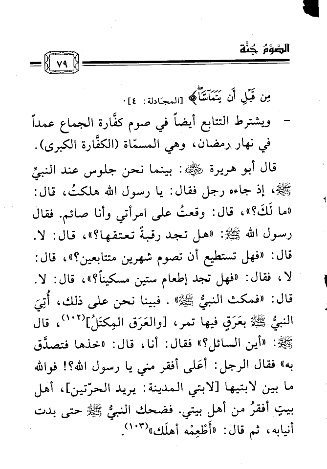 قال أبو هريرة رضي الله عنه: بينما نحن جلوس عند النبيِّ صلى الله عليه وسلم، إذ جاءه رجل فقال: يا رسول الله هلكتُ، قال: «ما لَكَ؟» ، قال: وقعتُ على امرأتي وأنا صائم. فقال رسول الله صلى الله عليه وسلم: «هل تجد رقبةً تعتقها؟» ، قال: لا. قال: «فهل تستطيع أن تصوم شهرين متتابعين؟» ، قال: لا، فقال: «فهل تجد إطعام ستين مسكيناً؟» ، قال: لا. قال: «فمكث النبيُّ صلى الله عليه وسلم» . فبينا نحن على ذلك، أُتِِيَ النبيُّ صلى الله عليه وسلم بعَرَقٍ فيها تمر، [والعَرَق المِكتَلُ] (¬102) ، قال صلى الله عليه وسلم: «أين السائل؟» فقال: أنا، قال: «خذها فتصدَّق به» فقال الرجل: أعَلى أفقر مني يا رسول الله؟! فوالله ما بين لابتيها [لابتي المدينة: يريد الحرّتين] ، أهل بيتٍ أفقرُ من أهل بيتي. فضحك النبيُّ صلى الله عليه وسلم حتى بدت أنيابه، ثم قال: «أَطْعِمْه أهلَك» (¬103) .