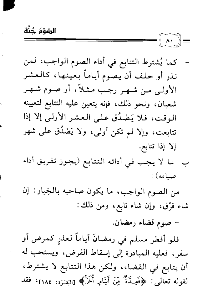 - ... كما يُشترط التتابع في أداء الصوم الواجب، لمن نذر أو حلف أن يصوم أياماً بعينها، كالعشر الأولى من شهر رجب مثلاً، أو صوم شهر شعبان، ونحو ذلك، فإنه يتعين عليه التتابع لتعيينه الوقت، فلا يَصْدُق على العشر الأولى إلا إذا تتابعت، وإلا لم تكن أولى، ولا يَصْدُُق على شهر إلا إذا تتابع.
