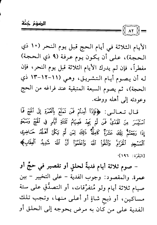 قال تعالى: {فَإِذَا أَمِنْتُمْ فَمَنْ تَمَتَّعَ بِالْعُمْرَةِ إِلَى الْحَجِّ فَمَا اسْتَيْسَرَ مِنَ الْهَدْيِ فَمَنْ لَمْ يَجِدْ فَصِيَامُ ثَلاَثَةِ أَيَّامٍ فِي الْحَجِّ وَسَبْعَةٍ إِذَا رَجَعْتُمْ تِلْكَ عَشَرَةٌ كَامِلَةٌ ذَلِكَ لِمَنْ لَمْ يَكُنْ أَهْلُهُ حَاضِرِي الْمَسْجِدِ الْحَرَامِ وَاتَّقُوا اللَّهَ وَاعْلَمْوا أَنَّ اللَّهَ شَدِيدُ الْعِقَابِ} [البَقَرَة: 196] .