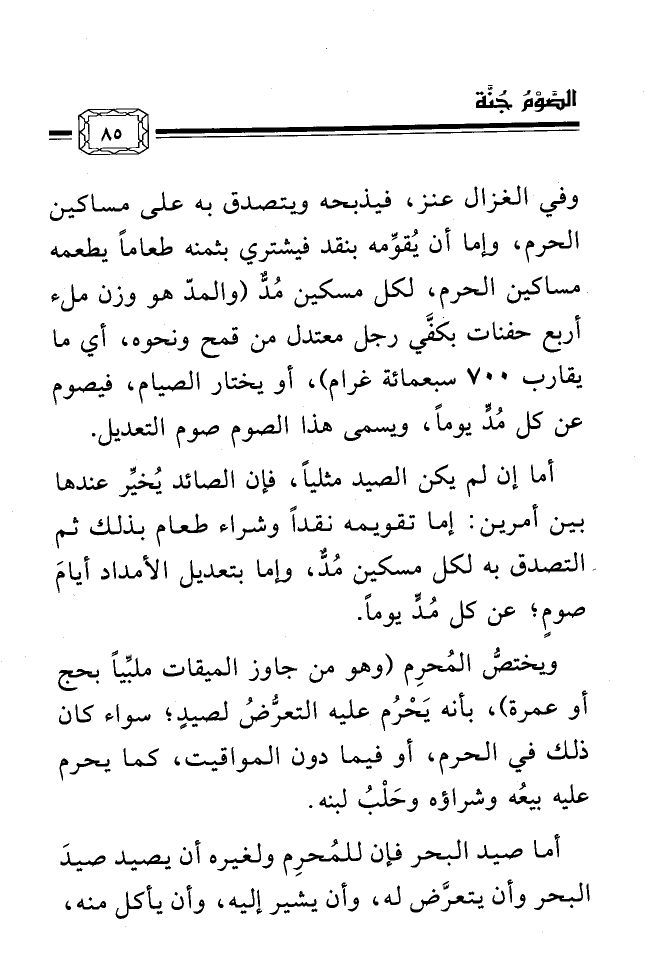 وفي الغزال عنز، فيذبحه ويتصدق به على مساكين الحرم، وإما أن يُقوِّمه بنقد فيشتري بثمنه طعاماً يطعمه مساكين الحرم، لكل مسكين مُدٌّ (والمدّ هو وزن ملء أربع حفنات بكفَّي رجل معتدل من قمح ونحوه، أي ما يقارب 700 سبعمائة غرام) ، أو يختار الصيام، فيصوم عن كل مُدٍّ يوماً، ويسمى هذا الصوم صوم التعديل.
