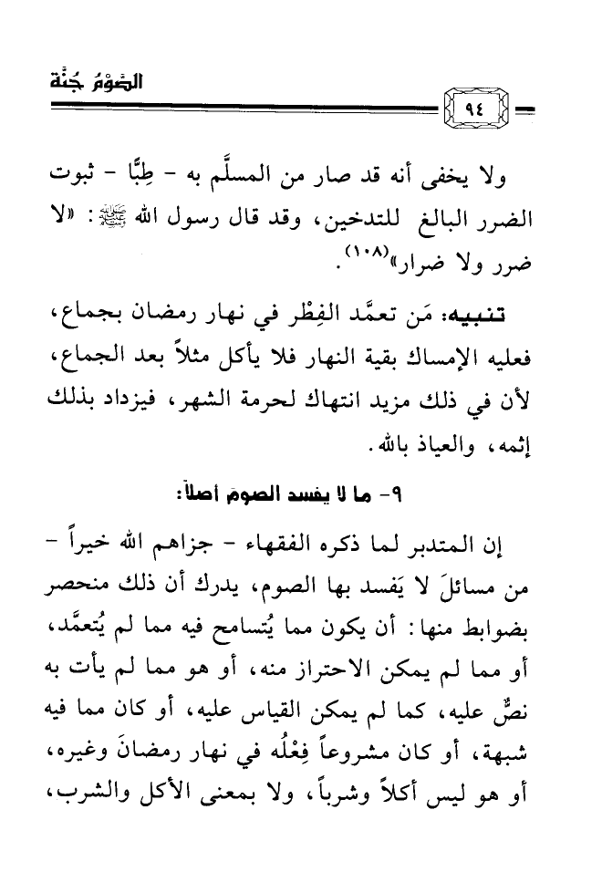 ولا يخفى أنه قد صار من المسلَّم به - طِبًّا - ثبوت الضرر البالغ للتدخين، وقد قال رسول الله صلى الله عليه وسلم: «لا ضرر ولا ضرار» (¬108) .