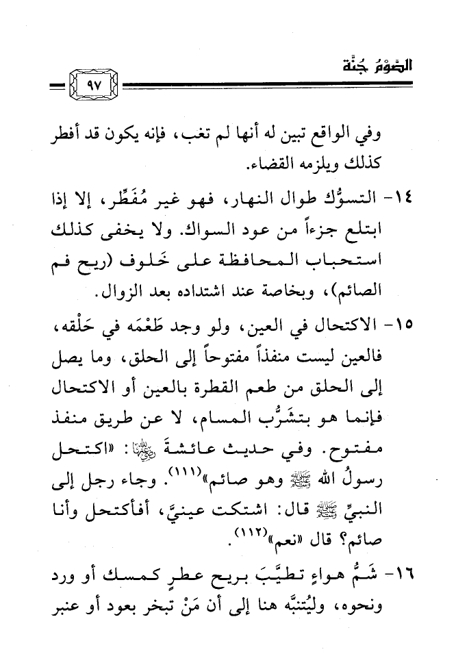 14- التسوُّك طوال النهار، فهو غير مُفَطِّر، إلا إذا ابتلع جزءاً من عود السواك. ولا يخفى كذلك استحباب المحافظة على خَلوف (ريح فم الصائم) ، وبخاصة عند اشتداده بعد الزوال.