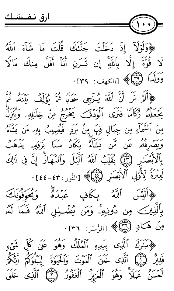 {وَلَوْلاَ إِذْ دَخَلْتَ جَنَّتَكَ قُلْتَ مَا شَاءَ اللَّهُ لاَ قُوَّةَ إِلاَّ بِاللَّهِ إِنْ تَرَنِ أَنَا أَقَلَّ مِنْكَ مَالاً وَوَلَدًا *} [الكهف: 39] .