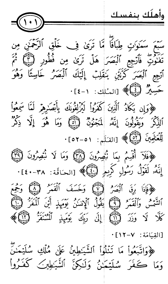 سَبْعَ سَمَاوَاتٍ طِبَاقًا مَا تَرَى فِي خَلْقِ الرَّحْمَانِ مِنْ تَفَاوُتٍ فَارْجِعِ الْبَصَرَ هَلْ تَرَى مِنْ فُطُورٍ *ثُمَّ ارْجِعِ الْبَصَرَ كَرَّتَيْنِ يَنْقَلِبْ إِلَيْكَ الْبَصَرُ خَاسِئًا وَهُوَ حَسِيرٌ *} [المُلك: 1-4] .