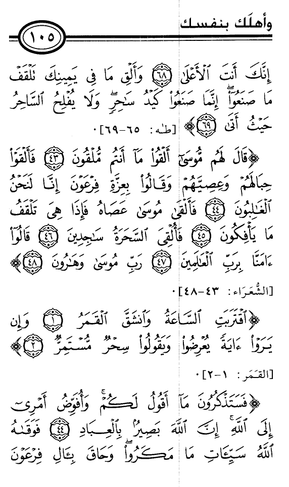 إِنَّكَ أَنْتَ الأَعْلَى *وَأَلْقِ مَا فِي يَمِينِكَ تَلْقَفْ مَا صَنَعُوا إِنَّمَا صَنَعُوا كَيْدُ سَاحِرٍ وَلاَ يُفْلِحُ السَّاحِرُ حَيْثُ أَتَى *} [طه: 65-69] .