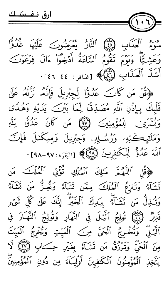 {قُلِ اللَّهُمَّ مَالِكَ الْمُلْكِ تُؤْتِي الْمُلْكَ مَنْ تَشَاءُ وَتَنْزِعُ الْمُلْكَ مِمَّنْ تَشَاءُ وَتُعِزُّ مَنْ تَشَاءُ وَتُذِلُّ مَنْ تَشَاءُ بِيَدِكَ الْخَيْرُ إِنَّكَ عَلَى كُلِّ شَيْءٍ قَدِيرٌ *تُولِجُ اللَّيْلَ فِي النَّهَارِ وَتُولِجُ النَّهَارَ فِي اللَّيْلِ وَتُخْرِجُ الْحَيَّ مِنَ الْمَيِّتِ وَتُخْرِجُ الْمَيِّتَ مِنَ الْحَيِّ وَتَرْزُقُ مَنْ تَشَاءُ بِغَيْرِ حِسَابٍ *لاَ يَتَّخِذِ الْمُؤْمِنُونَ الْكَافِرِينَ أَوْلِيَاءَ مِنْ دُونِ الْمُؤْمِنِينَ
