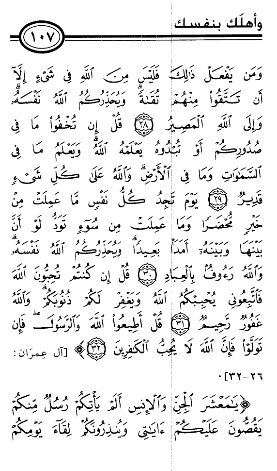 وَمَنْ يَفْعَلْ ذَلِكَ فَلَيْسَ مِنَ اللَّهِ فِي شَيْءٍ إِلاَّ أَنْ تَتَّقُوا مِنْهُمْ تُقَاةً وَيُحَذِّرُكُمُ اللَّهُ نَفْسَهُ وَإِلَى اللَّهِ الْمَصِيرُ *قُلْ إِنْ تُخْفُوا مَا فِي صُدُورِكُمْ أَوْ تُبْدُوهُ يَعْلَمْهُ اللَّهُ وَيَعْلَمُ مَا فِي السَّمَاوَاتِ وَمَا فِي الأَرْضِ وَاللَّهُ عَلَى كُلِّ شَيءٍ قَدِيرٌ *يَوْمَ تَجِدُ كُلُّ نَفْسٍ مَا عَمِلَتْ مِنْ خَيْرٍ مُحْضَرًا وَمَا عَمِلَتْ مِنْ سُوءٍ تَوَدُّ لَوْ أَنَّ بَيْنَهَا وَبَيْنَهُ أَمَدًا بَعِيدًا وَيُحَذِّرُكُمُ اللَّهُ نَفْسَهُ وَاللَّهُ رَؤُوفٌ بِالْعِبَادِ *قُلْ إِنْ كُنْتُمْ تُحِبُّونَ اللَّهَ فَاتَّبِعُونِي يُحْبِبْكُمُ اللَّهُ وَيَغْفِرْ لَكُمْ ذُنُوبَكُمْ وَاللَّهُ غَفُورٌ رَحِيمٌ *قُلْ أَطِيعُوا اللَّهَ وَالرَّسُولَ فَإِنْ تَوَلَّوْا فَإِنَّ اللَّهَ لاَ يُحِبُّ الْكَافِرِينَ *} [آل عِمرَان: 26-32] .