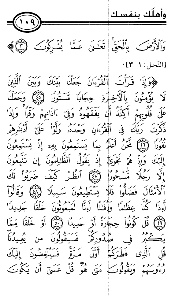 {وَإِذَا قَرَأْتَ الْقُرْآنَ جَعَلْنَا بَيْنَكَ وَبَيْنَ الَّذِينَ لاَ يُؤْمِنُونَ بِالآخِرَةِ حِجَابًا مَسْتُورًا *وَجَعَلْنَا عَلَى قُلُوبِهِمْ أَكِنَّةً أَنْ يَفْقَهُوهُ وَفِي آذَانِهِمْ وَقْرًا وَإِذَا ذَكَرْتَ رَبَّكَ فِي الْقُرْآنِ وَحْدَهُ وَلَّوْا عَلَى أَدْبَارِهِمْ نُفُورًا *نَحْنُ أَعْلَمُ بِمَا يَسْتَمِعُونَ بِهِ إِذْ يَسْتَمِعُونَ إِلَيْكَ وَإِذْ هُمْ نَجْوَى إِذْ يَقُولُ الظَّالِمُونَ إِنْ تَتَّبِعُونَ إِلاَّ رَجُلاً مَسْحُورًا *انْظُرْ كَيْفَ ضَرَبُوا لَكَ الأَمْثَالَ فَضَلُّوا فَلاَ يَسْتَطِيعُونَ سَبِيلاً *وَقَالُوا أَإِذَا كُنَّا عِظَامًا وَرُفَاتًا أَإِنَّا لَمَبْعُوثُونَ خَلْقًا جَدِيدًا *قُلْ كُونُوا حِجَارَةً أَوْ حَدِيدًا *أَوْ خَلْقًا مِمَّا يَكْبُرُ فِي صُدُورِكُمْ فَسَيَقُولُونَ مَنْ يُعِيدُنَا قُلِ الَّذِي فَطَرَكُمْ أَوَّلَ مَرَّةٍ فَسَيُنْغِضُونَ إِلَيْكَ رُؤُوسَهُمْ وَيَقُولُونَ مَتَى هُوَ قُلْ عَسَى أَنْ يَكُونَ