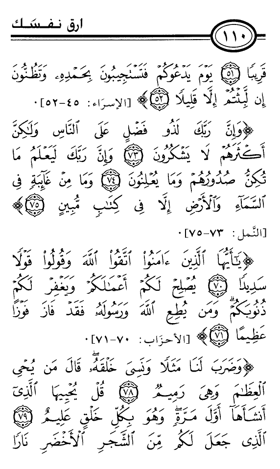 {وَإِنَّ رَبَّكَ لَذُو فَضْلٍ عَلَى النَّاسِ وَلَكِنَّ أَكْثَرَهُمْ لاَ يَشْكُرُونَ *وَإِنَّ رَبَّكَ لَيَعْلَمُ مَا تُكِنُّ صُدُورُهُمْ وَمَا يُعْلِنُونَ *وَمَا مِنْ غَائِبَةٍ فِي السَّمَاءِ وَالأَرْضِ إِلاَّ فِي كِتَابٍ مُبِينٍ *} [النَّمل: 73-75] .