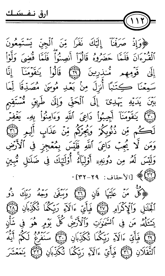 {وَإِذْ صَرَفْنَا إِلَيْكَ نَفَرًا مِنَ الْجِنِّ يَسْتَمِعُونَ الْقُرْآنَ فَلَمَّا حَضَرُوهُ قَالُوا أَنْصِتُوا فَلَمَّا قُضِيَ وَلَّوْا إِلَى قَوْمِهِمْ مُنْذِرِينَ *قَالُوا يَاقَوْمَنَا إِنَّا سَمِعْنَا كِتَابًا أُنْزِلَ مِنْ بَعْدِ مُوسَى مُصَدِّقًا لِمَا بَيْنَ يَدَيْهِ يَهْدِي إِلَى الْحَقِّ وَإِلَى طَرِيقٍ مُسْتَقِيمٍ *يَاقَوْمَنَا أَجِيبُوا دَاعِيَ اللَّهِ وَآمِنُوا بِهِ يَغْفِرْ لَكُمْ مِنْ ذُنُوبِكُمْ وَيُجِرْكُمْ مِنْ عَذَابٍ أَلِيمٍ *وَمَنْ لاَ يُجِبْ دَاعِيَ اللَّهِ فَلَيْسَ بِمُعْجِزٍ فِي الأَرْضِ وَلَيْسَ لَهُ مِنْ دُونِهِ أَوْلِيَاءُ أُولَئِكَ فِي ضَلاَلٍ مُبِينٍ *} [الأحقاف: 29-32] .