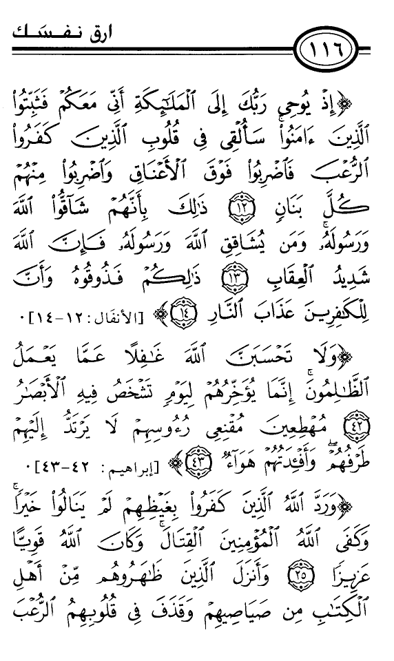{إِذْ يُوحِي رَبُّكَ إِلَى الْمَلاَئِكَةِ أَنِّي مَعَكُمْ فَثَبِّتُوا الَّذِينَ آمَنُوا سَأُلْقِي فِي قُلُوبِ الَّذِينَ كَفَرُوا الرُّعْبَ فَاضْرِبُوا فَوْقَ الأَعْنَاقِ وَاضْرِبُوا مِنْهُمْ كُلَّ بَنَانٍ *ذَلِكَ بِأَنَّهُمْ شَاقُّوا اللَّهَ وَرَسُولَهُ وَمَنْ يُشَاقِقِ اللَّهَ وَرَسُولَهُ فَإِنَّ اللَّهَ شَدِيدُ الْعِقَابِ *ذَلِكُمْ فَذُوقُوهُ وَأَنَّ لِلْكَافِرِينَ عَذَابَ النَّارِ *} [الأنفَال:12-14] .