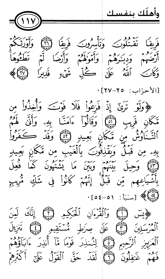 {يس *وَالْقُرْآنِ الْحَكِيمِ *إِنَّكَ لَمِنَ الْمُرْسَلِينَ *عَلَى صِرَاطٍ مُسْتَقِيمٍ *تَنْزِيلَ الْعَزِيزِ الرَّحِيمِ *لِتُنْذِرَ قَوْمًا مَا أُنْذِرَ آبَاؤُهُمْ فَهُمْ غَافِلُونَ *لَقَدْ حَقَّ الْقَوْلُ عَلَى أَكْثَرِهِمْ