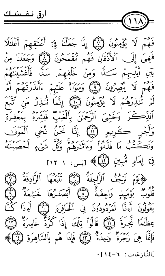 فَهُمْ لاَ يُؤْمِنُونَ *إِنَّا جَعَلْنَا فِي أَعْنَاقِهِمْ أَغْلاَلاً فَهِيَ إِلَى الأَذْقَانِ فَهُمْ مُقْمَحُونَ *وَجَعَلْنَا مِنْ بَيْنِ أَيْدِيهِمْ سَدًّا وَمِنْ خَلْفِهِمْ سَدًّا فَأَغْشَيْنَاهُمْ فَهُمْ لاَ يُبْصِرُونَ *وَسَوَاءٌ عَلَيْهِمْ أَأَنْذَرْتَهُمْ أَمْ لَمْ تُنْذِرَهُمْ لاَ يُؤْمِنُونَ *إِنَّمَا تُنْذِرُ مَنِ اتَّبَعَ الذِّكْرَ وَخَشِيَ الرَّحْمَانَ بِالْغَيْبِ فَبَشِّرْهُ بِمَغْفِرَةٍ وَأَجْرٍ كَرِيمٍ *إِنَّا نَحْنُ نُحْيِي الْمَوْتَى وَنَكْتُبُ مَا قَدَّمُوا وَآثَارَهُمْ وَكُلَّ شَيْءٍ أَحْصَيْنَاهُ فِي إِمَامٍ مُبِينٍ *} [يس: 1-12] .
