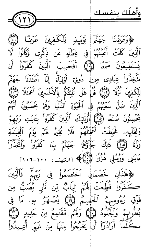{وَعَرَضْنَا جَهَنَّمَ يَوْمَئِذٍ لِلْكَافِرِينَ عَرْضًا *الَّذِينَ كَانَتْ أَعْيُنُهُمْ فِي غِطَاءٍ عَنْ ذِكْرِي وَكَانُوا لاَ يَسْتَطِيعُونَ سَمْعًا *أَفَحَسِبَ الَّذِينَ كَفَرُوا أَنْ يَتَّخِذُوا عِبَادِي مِنْ دُونِي أَوْلِيَاءَ إِنَّا أَعْتَدْنَا جَهَنَّمَ لِلْكَافِرِينَ نُزُلاً *قُلْ هَلْ نُنَبِّئُكُمْ بِالأَخْسَرَينِ أَعْمَالاً *الَّذِينَ ضَلَّ سَعْيُهُمْ فِي الْحَيَاةِ الدُّنْيَا وَهُمْ يَحْسَبُونَ أَنَّهُمْ يُحْسِنُونَ صُنْعًا *أُولَئِكَ الَّذِينَ كَفَرُوا بِآيَاتِ رَبِّهِمْ وَلِقَائِهِ فَحَبِطَتْ أَعْمَالُهُمْ فَلاَ نُقِيمُ لَهُمْ يَوْمَ الْقِيَامَةِ وَزْناً *ذَلِكَ جَزَاؤُهُمْ جَهَنَّمُ بِمَا كَفَرُوا وَاتَّخَذُوا آيَاتِي وَرُسُلِي هُزُوًا *} [الكهف: 100-106] .