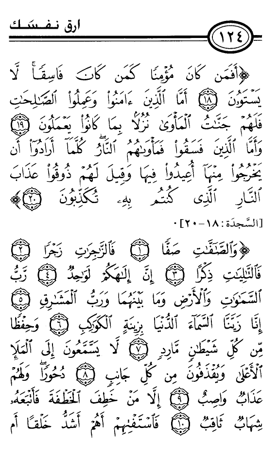 {وَالصَّآفَّاتِ صَفًّا *فَالزَّاجِرَاتِ زَجْرًا *فَالتَّالِيَاتِ ذِكْرًا *إِنَّ إِلَهَكُمْ لَوَاحِدٌ *رَبُّ السَّمَاوَاتِ وَالأَرْضِ وَمَا بَيْنَهُمَا وَرَبُّ الْمَشَارِقِ *إِنَّا زَيَّنَّا السَّمَاءَ الدُّنْيَا بِزِينَةٍ الْكَوَاكِبِ *وَحِفْظًا مِنْ كُلِّ شَيْطَانٍ مَارِدٍ *لاَ يَسَّمَّعُونَ إِلَى الْمَلإَِ الأَعْلَى وَيُقْذَفُونَ مِنْ كُلِّ جَانِبٍ *دُحُورًا وَلَهُمْ عَذَابٌ وَاصِبٌ *إِلاَّ مَنْ خَطِفَ الْخَطْفَةَ فَأَتْبَعَهُ شِهَابٌ ثَاقِبٌ *فَاسْتَفْتِهِمْ أَهُمْ أَشَدُّ خَلْقًا أَمْ
