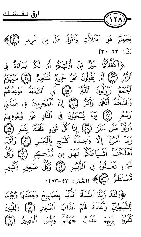 {أَكُفَّارُكُمْ خَيْرٌ مِنْ أُولَئِكُمْ أَمْ لَكُمْ بَرَاءَةٌ فِي الزُّبُرِ *أَمْ يَقُولُونَ نَحْنُ جَمِيعٌ مُنْتَصِرٌ *سَيُهْزَمُ الْجَمْعُ وَيُوَلُّونَ الدُّبُرَ *بَلِ السَّاعَةُ مَوْعِدُهُمْ وَالسَّاعَةُ أَدْهَى وَأَمَرُّ *إِنَّ الْمُجْرِمِينَ فِي ضَلاَلٍ وَسُعُرٍ *يَوْمَ يُسْحَبُونَ فِي النَّارِ عَلَى وَجُوهِهِمْ ذُوقُوا مَسَّ سَقَرَ *إِنَّا كُلَّ شَيْءٍ خَلَقْنَاهُ بِقَدَرٍ *وَمَا أَمْرُنَا إِلاَّ وَاحِدَةٌ كَلَمْحٍ بِالْبَصَرِ *وَلَقَدْ أَهْلَكْنَا أَشْيَاعَكُمْ فَهَلْ مِنْ مُدَّكِرٍ *وَكُلُّ شَيْءٍ فَعَلُوهُ فِي الزُّبُرِ *وَكُلُّ صَغِيرٍ وَكَبِيرٍ مُسْتَطَرٌ *} [القَمَر: 43-53] .