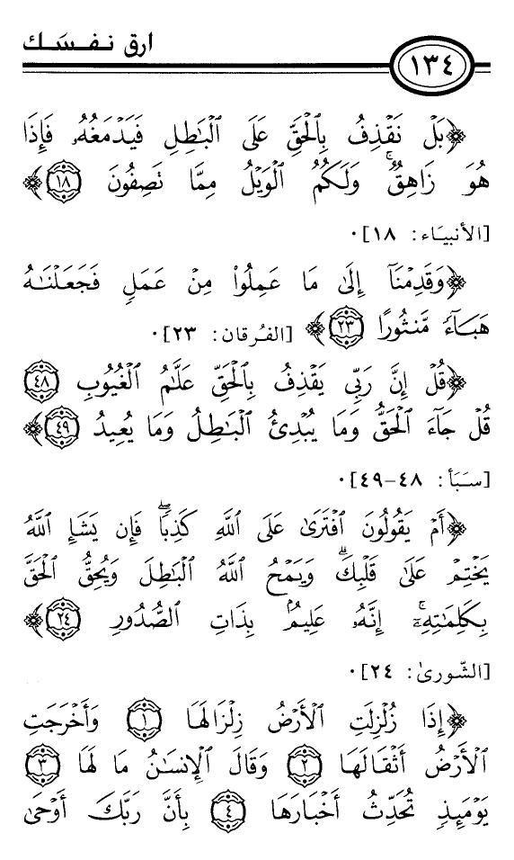 {بَلْ نَقْذِفُ بِالْحَقِّ عَلَى الْبَاطِلِ فَيَدْمَغُهُ فَإِذَا هُوَ زَاهِقٌ وَلَكُمُ الْوَيْلُ مِمَّا تَصِفُونَ *} [الأنبيَاء: 18] .