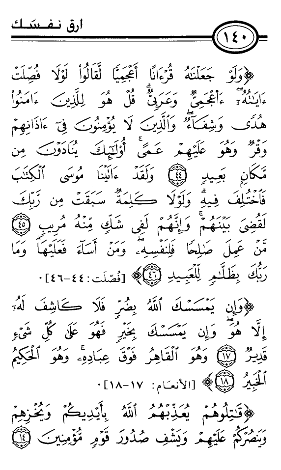 {وَلَوْ جَعَلْنَاهُ قُرْآناً أَعْجَمِيًّا لَقَالُوا لَوْلاَ فُصِّلَتْ آيَاتُهُ أَأَعْجَمِيٌّ وَعَرَبِيٌّ قُلْ هُوَ لِلَّذِينَ آمَنُوا هُدىً وَشِفَاءٌ وَالَّذِينَ لاَ يُؤْمِنُونَ فِي آذَانِهِمْ وَقْرٌ وَهُوَ عَلَيْهِمْ عَمىً أُولَئِكَ يُنَادَوْنَ مِنْ مَكَانٍ بَعِيدٍ *وَلَقَدْ آتَيْنَا مُوسَى الْكِتَابَ فَاخْتُلِفَ فِيهِ وَلَوْلاَ كَلِمَةٌ سَبَقَتْ مِنْ رَبِّكَ لَقُضِيَ بَيْنَهُمْ وَإِنَّهُمْ لَفِي شَكٍّ مِنْهُ مُرِيبٍ *مَنْ عَمِلَ صَالِحًا فَلِنَفْسِهِ وَمَنْ أَسَاءَ فَعَلَيْهَا وَمَا رَبُّكَ بِظَلاَّمٍ لِلْعَبِيدِ *} . [فُصّلَت:44-46]
