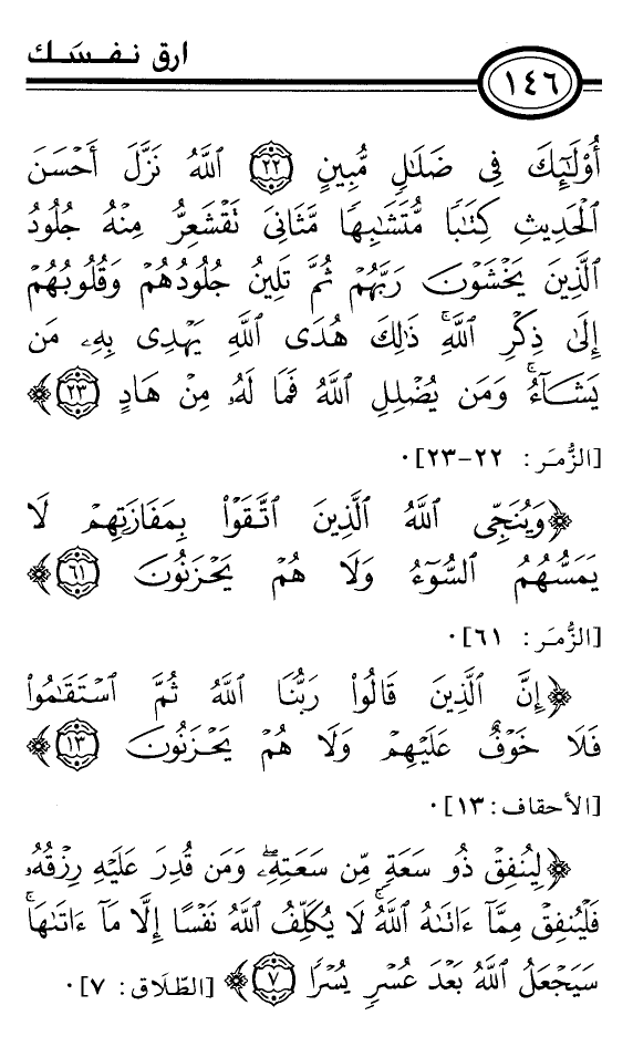 أُولَئِكَ فِي ضَلاَلٍ مُبِينٍ *اللَّهُ نَزَّلَ أَحْسَنَ الْحَدِيثِ كِتَابًا مُتَشَابِهًا مَثَانِيَ تَقْشَعِرُّ مِنْهُ جُلُودُ الَّذِينَ يَخْشَوْنَ رَبَّهُمْ ثُمَّ تَلِينُ جُلُودُهُمْ وَقُلُوبُهُمْ إِلَى ذِكْرِ اللَّهِ ذَلِكَ هُدَى اللَّهِ يَهْدِي بِهِ مَنْ يَشَاءُ وَمَنْ يُضْلِلِ اللَّهُ فَمَا لَهُ مِنْ هَادٍ *} . [الزُّمَر: 22-23]