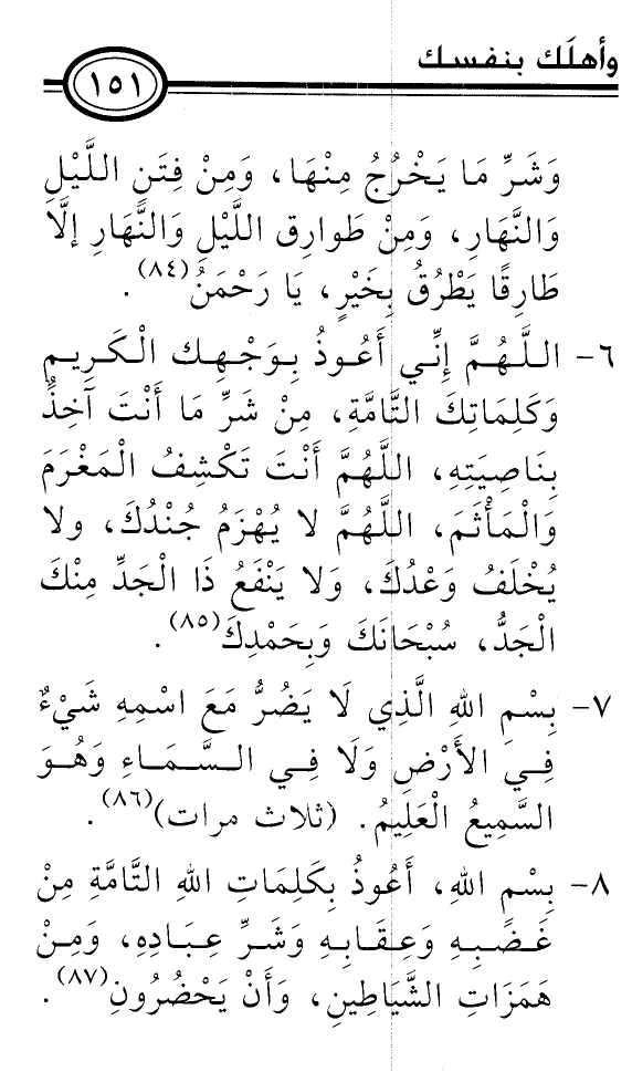 بِسْمِ اللهِ الَّذِي لاَ يَضُرُّ مَعَ اسْمِهِ شَيْءٌ فِي الأَرْضِ وَلاَ فِي السَّمَاءِ وَهُوَ السَّمِيعُ الْعَلِيمُ. (ثلاث مرات) (¬86) .