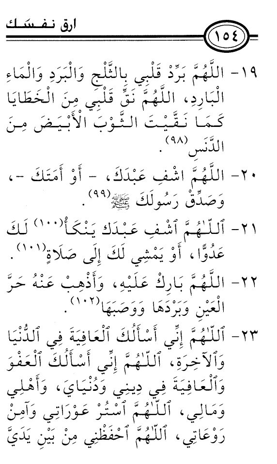اللَّهُمَّ بَرِّدْ قَلْبِي بِالثَّلْجِ وَالْبَرَدِ وَالْمَاءِ الْبَارِدِ، اللَّهُمَّ نَقِّ قَلْبِي مِنَ الْخَطَايَا كَمَا نَقَّيْتَ الثَّوْبَ الأَْبْيَضَ مِنَ الدَّنَسِ (¬98) .