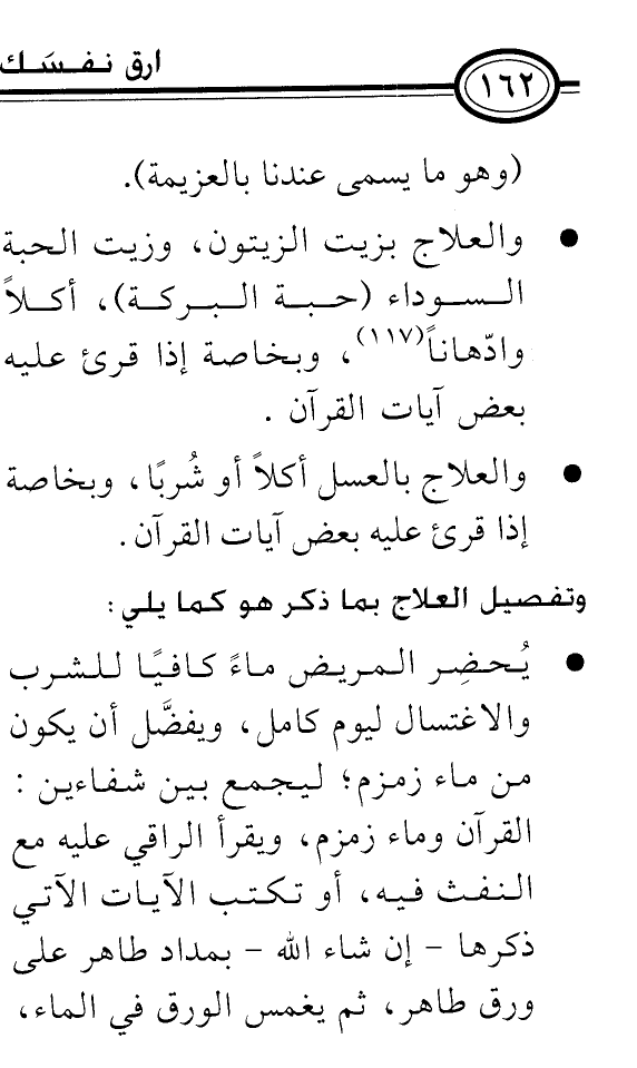 - ... والعلاج بزيت الزيتون، وزيت الحبة السوداء (حبة البركة) ، أكلاً وادّهاناً (¬117) ، وبخاصة إذا قرئ عليه بعض آيات القرآن.