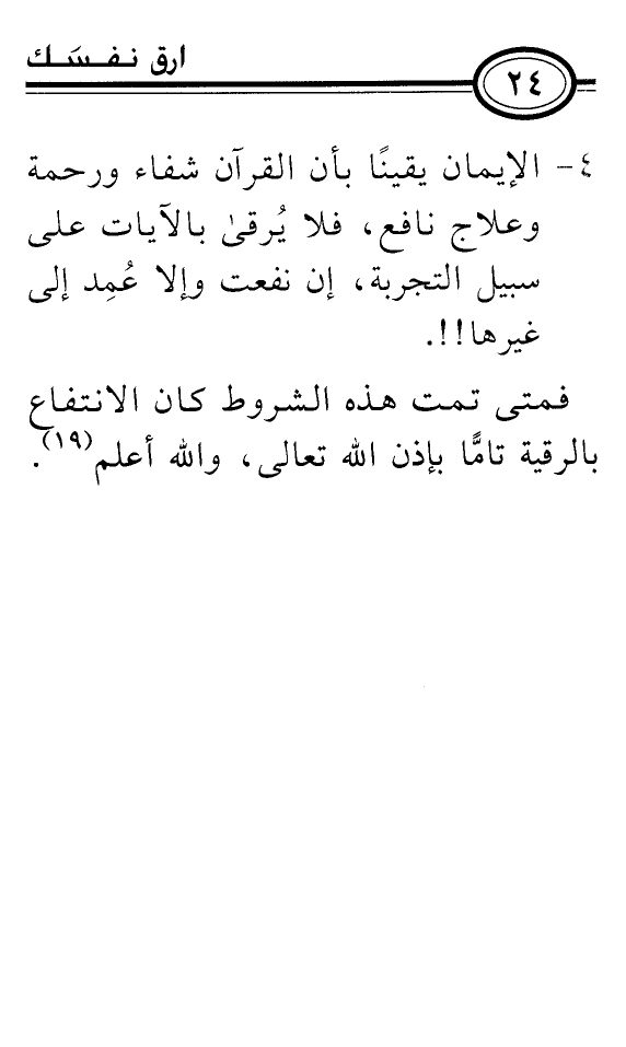 4- ... الإيمان يقينًا بأن القرآن شفاء ورحمة وعلاج نافع، فلا يُرقى بالآيات على سبيل التجربة، إن نفعت وإلا عُمِد إلى غيرها!!.