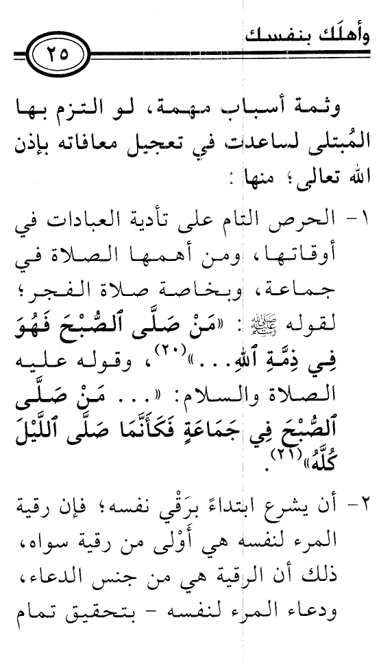 1- ... الحرص التام على تأدية العبادات في أوقاتها، ومن أهمها الصلاة في جماعة، وبخاصة صلاة الفجر؛ لقوله صلى الله عليه وسلم: مَنْ صَلَّى الصُّبْحَ فَهُوَ فِي ذِمَّةِ اللهِ ... (¬20) ، وقوله عليه الصلاة والسلام: ... مَنْ صَلَّى الصُّبْحَ فِي جَمَاعَةٍ فَكَأَنَّمَا صَلَّى اللَّيْلَ كُلَّهُ (¬21) .