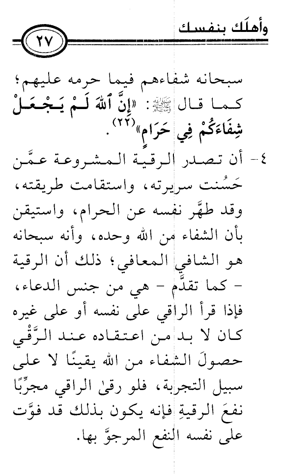 4- ... أن تصدر الرقية المشروعة عمَّن حَسُنت سريرته، واستقامت طريقته، وقد طهَّر نفسه عن الحرام، واستيقن بأن الشفاء من الله وحده، وأنه سبحانه هو الشافي المعافي؛ ذلك أن الرقية - كما سبق - هي من جنس الدعاء، فإذا قرأ الراقي على نفسه أو على غيره كان لا بد من اعتقاده عند الرَّقْي حصولَ الشفاء من الله يقينًا لا على سبيل التجربة، فلو رقى الراقي مجرِّبًا نفعَ الرقيةِ فإنه يكون بذلك قد فوَّت على نفسه النفع المرجوَّ بها.