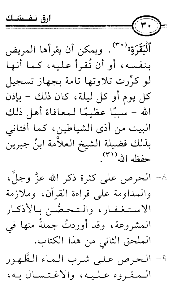 الْبَقَرَةِ (¬30) . ويمكن أن يقرأها المريض بنفسه، أو أن تُقرأ عليه، كما أنها لو كرِّرت تلاوتها تامة بجهاز تسجيل كل يوم أو كل ليلة، كان ذلك - بإذن الله - سببًا عظيمًا لمعافاة أهل ذلك البيت من أذى الشياطين، كما أفتاني بذلك فضيلة الشيخ العلاَّمة ابنُ جبرين حفظه الله (¬31) .