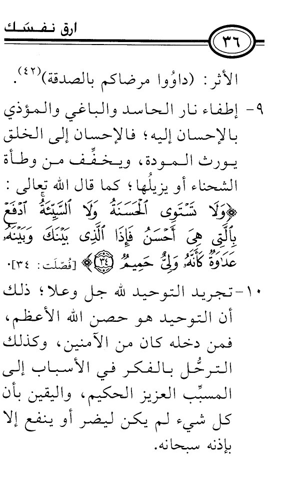 9- ... إطفاء نار الحاسد والباغي والمؤذي بالإحسان إليه؛ فالإحسان إلى الخلق يورث المودة، ويخفِّف من وطأة الشحناء أو يزيلُها؛ كما قال الله تعالى: {وَلاَ تَسْتَوِي الْحَسَنَةُ وَلاَ السَّيِّئَةُ ادْفَعْ بِالَّتِي هِيَ أَحْسَنُ فَإِذَا الَّذِي بَيْنَكَ وَبَيْنَهُ عَدَاوَةٌ كَأَنَّهُ وَلِيٌّ حَمِيمٌ *} [فُصّلَت: 34] .