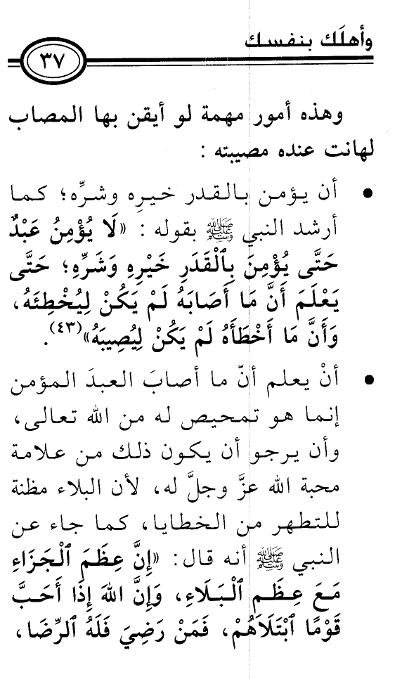 - أن يؤمن بالقدر خيرِه وشرِّه؛ كما أرشد النبي صلى الله عليه وسلم بقوله: لاَ يُؤْمِنُ عَبْدٌ حَتَّى يُؤْمِنَ بِالْقَدَرِ خَيْرِهِ وَشَرِّهِ؛ حَتَّى يَعْلَمَ أَنَّ مَا أَصَابَهُ لَمْ يَكُنْ لِيُخْطِئَهُ، وَأَنَّ مَا أَخْطَأَهُ لَمْ يَكُنْ لِيُصِيبَهُ (¬43) .
