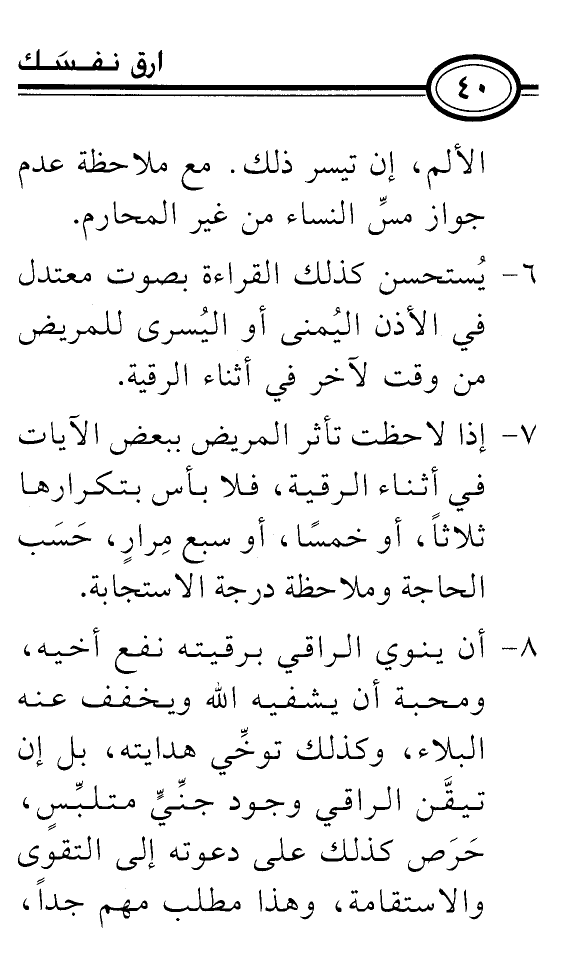 6- ... يُستحسن كذلك القراءة بصوت معتدل في الأذن اليُمنى أو اليُسرى للمريض من وقت لآخر في أثناء الرقية.