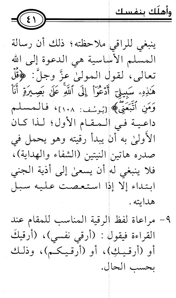 9- ... مراعاة لفظ الرقية المناسب للمقام عند القراءة فيقول: (أرقي نفسي) ، (أرقيكَ أو (أرقيكِ) ، أو (أرقيكم) ، وذلك بحسب الحال.