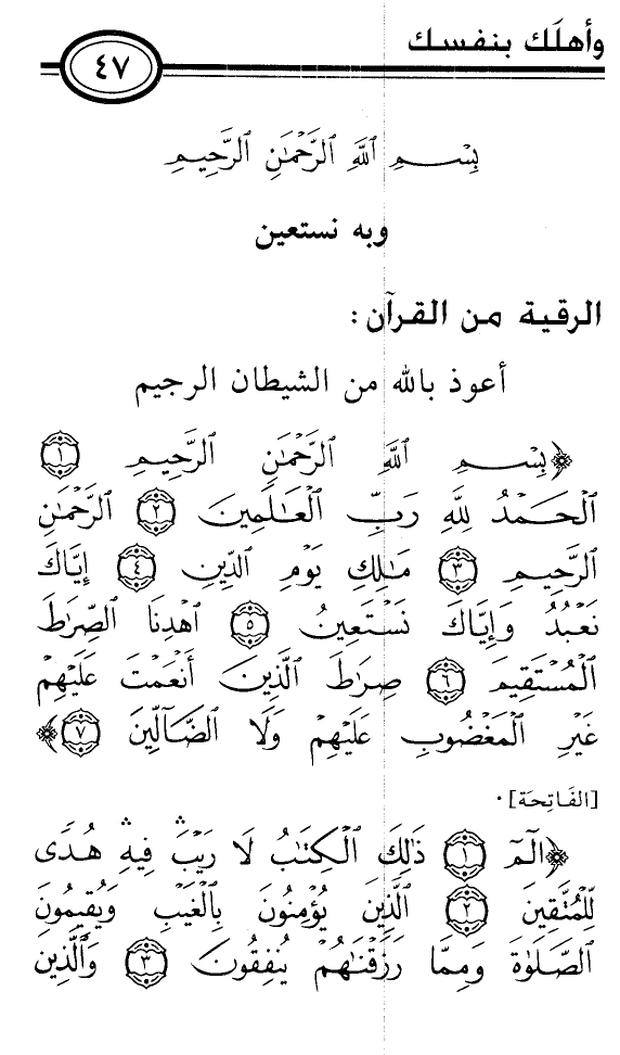 [الفَاتِحَة] {بِسْمِ اللَّهِ الرَّحْمَانِ الرَّحِيمِ *الْحَمْدُ لِلَّهِ رَبِّ الْعَالَمِينَ *الرَّحْمَانِ الرَّحِيمِ *مَالِكِ يَوْمِ الدِّينِ *إِيَّاكَ نَعْبُدُ وَإِيَّاكَ نَسْتَعِينُ *اهْدِنَا الصِّرَاطَ الْمُسْتَقِيمَ *صِرَاطَ الَّذِينَ أَنْعَمْتَ عَلَيْهِمْ غَيْرِ الْمَغْضُوبِ عَلَيْهِمْ وَلاَ الضَّالِّينَ *} .