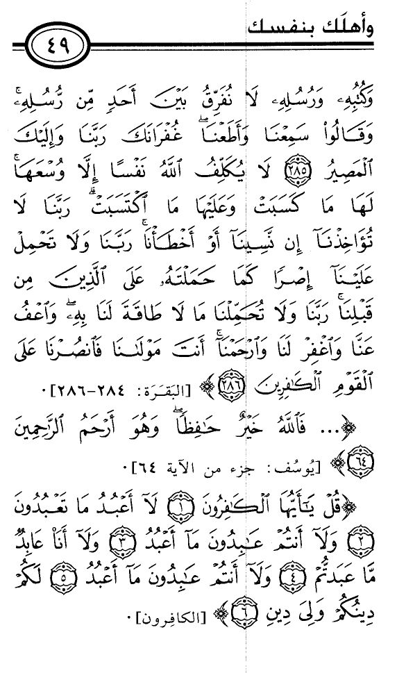 وَكُتُبِهِ وَرُسُلِهِ لاَ نُفَرِّقُ بَيْنَ أَحَدٍ مِنْ رُسُلِهِ وَقَالُوا سَمِعْنَا وَأَطَعْنَا غُفْرَانَكَ رَبَّنَا وَإِلَيْكَ الْمَصِيرُ *لاَ يُكَلِّفُ اللَّهُ نَفْسًا إِلاَّ وُسْعَهَا لَهَا مَا كَسَبَتْ وَعَلَيْهَا مَا اكْتَسَبَتْ رَبَّنَا لاَ تُؤَاخِذْنَا إِنْ نَسِيْنَا أَوْ أَخْطَأْنَا رَبَّنَا وَلاَ تَحْمِلْ عَلَيْنَا إِصْرًا كَمَا حَمَلْتَهُ عَلَى الَّذِينَ مِنْ قَبْلِنَا رَبَّنَا وَلاَ تُحَمِّلْنَا مَا لاَ طَاقَةَ لَنَا بِهِ وَاعْفُ عَنَّا وَاغْفِرْ لَنَا وَارْحَمْنَا أَنْتَ مَوْلاَنَا فَانْصُرْنَا عَلَى الْقَوْمِ الْكَافِرِينَ *} [البَقَرَة: 284-286] .