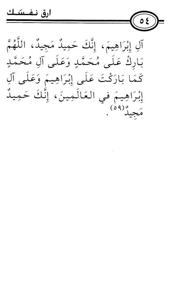آلِ إِبْرَاهِيمَ، إِنَّكَ حَمِيدٌ مَجِيدٌ، اللَّهُمَّ بَارِكْ عَلَى مُحَمَّدٍ وَعَلَى آلِ مُحَمَّدٍ كَمَا بَارَكْتَ عَلَى إِبْرَاهِيمَ وَعَلَى آلِ إِبْرَاهِيمَ في العَالَمِينَ، ِإنَّكَ حَمِيدٌ مَجِيدٌ (¬59) .