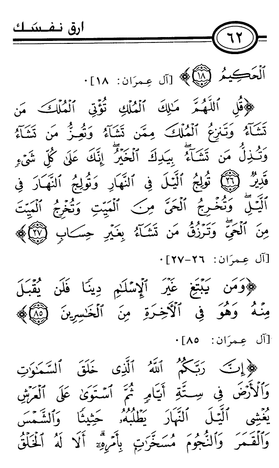 {قُلِ اللَّهُمَّ مَالِكَ الْمُلْكِ تُؤْتِي الْمُلْكَ مَنْ تَشَاءُ وَتَنْزِعُ الْمُلْكَ مِمَّنْ تَشَاءُ وَتُعِزُّ مَنْ تَشَاءُ وَتُذِلُّ مَنْ تَشَاءُ بِيَدِكَ الْخَيْرُ إِنَّكَ عَلَى كُلِّ شَيْءٍ قَدِيرٌ *تُولِجُ اللَّيْلَ فِي النَّهَارِ وَتُولِجُ النَّهَارَ فِي اللَّيْلِ وَتُخْرِجُ الْحَيَّ مِنَ الْمَيِّتِ وَتُخْرِجُ الْمَيِّتَ مِنَ الْحَيِّ وَتَرْزُقُ مَنْ تَشَاءُ بِغَيْرِ حِسَابٍ *} [آل عِمرَان: 26-27] .