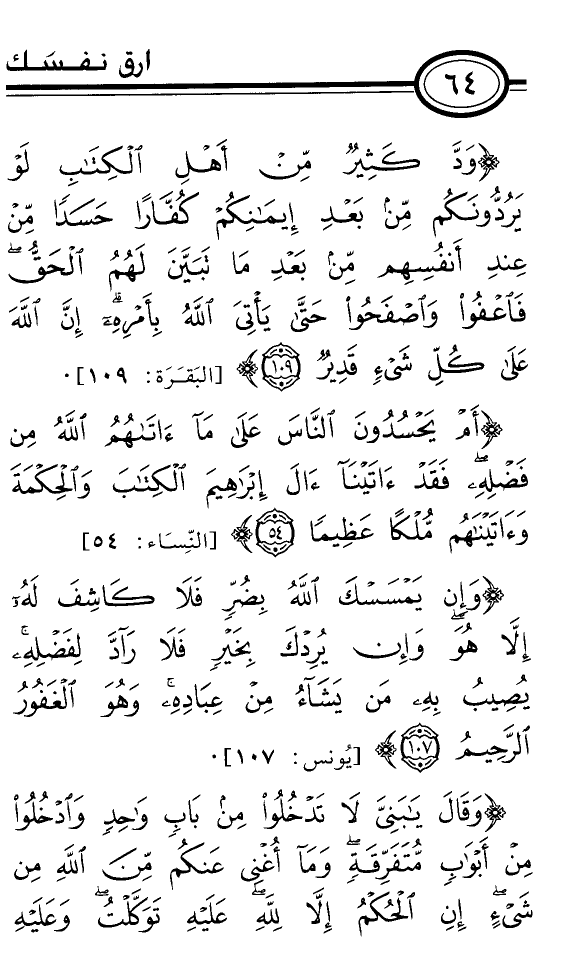 {وَدَّ كَثِيرٌ مِنْ أَهْلِ الْكِتَابِ لَوْ يَرُدُّونَكُمْ مِنْ بَعْدِ إِيمَانِكُمْ كُفَّارًا حَسَدًا مِنْ عِنْدِ أَنْفُسِهِمْ مِنْ بَعْدِ مَا تَبَيَّنَ لَهُمُ الْحَقُّ فَاعْفُوا وَاصْفَحُوا حَتَّى يَأْتِيَ اللَّهُ بِأَمْرِهِ إِنَّ اللَّهَ عَلَى كُلِّ شَيْءٍ قَدِيرٌ *} [البَقَرَة: 109] .