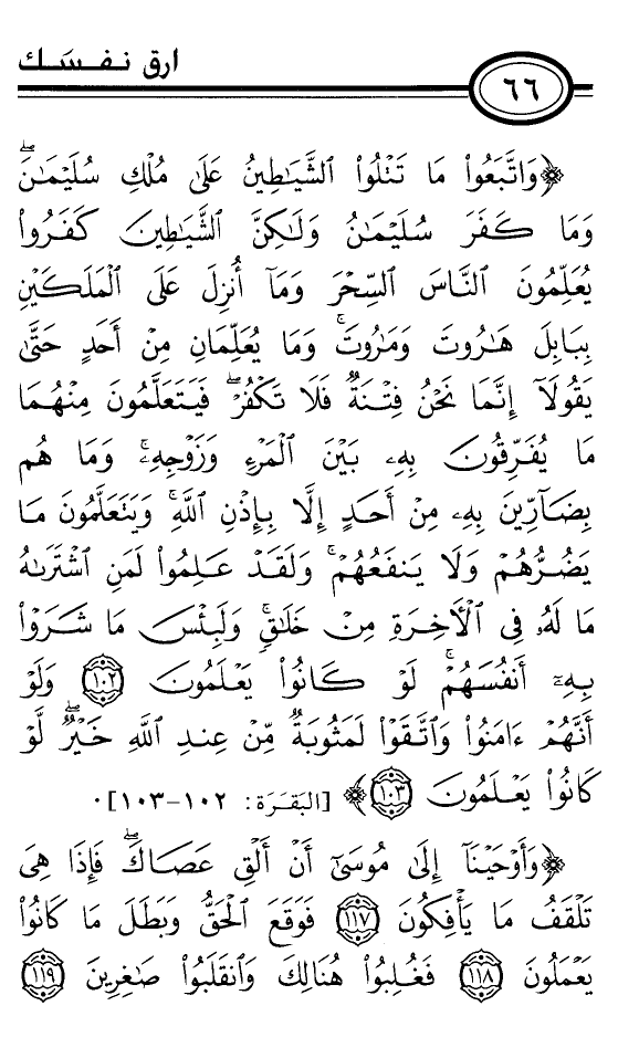 {وَاتَّبَعُوا مَا تَتْلُوا الشَّيَاطِينُ عَلَى مُلْكِ سُلَيْمَانَ وَمَا كَفَرَ سُلَيْمَانُ وَلَكِنَّ الشَّيَاطِينَ كَفَرُوا يُعَلِّمُونَ النَّاسَ السِّحْرَ وَمَا أُنْزِلَ عَلَى الْمَلَكَيْنِ بِبَابِلَ هَارُوتَ وَمَارُوتَ وَمَا يُعَلِّمَانِ مِنْ أَحَدٍ حَتَّى يَقُولاَ إِنَّمَا نَحْنُ فِتْنَةٌ فَلاَ تَكْفُرْ فَيَتَعَلَّمُونَ مِنْهُمَا مَا يُفَرِّقُونَ بِهِ بَيْنَ الْمَرْءِ وَزَوْجِهِ وَمَا هُمْ بِضَآرِّينَ بِهِ مِنْ أَحَدٍ إِلاَّ بِإِذْنِ اللَّهِ وَيَتَعَلَّمُونَ مَا يَضُرُّهُمْ وَلاَ يَنْفَعُهُمْ وَلَقَدْ عَلِمُوا لَمَنِ اُشْتَرَاهُ مَا لَهُ فِي الآخِرَةِ مِنْ خَلاَقٍ وَلَبِئْسَ مَا شَرَوْا بِهِ أَنْفُسَهُمْ لَوْ كَانُوا يَعْلَمُونَ *وَلَوْ أَنَّهُمْ آمَنُوا وَاتَّقَوْا لَمَثُوبَةٌ مِنْ عِنْدِ اللَّهِ خَيْرٌ لَوْ كَانُوا يَعْلَمُونَ *} [البَقَرَة: 102-103] .