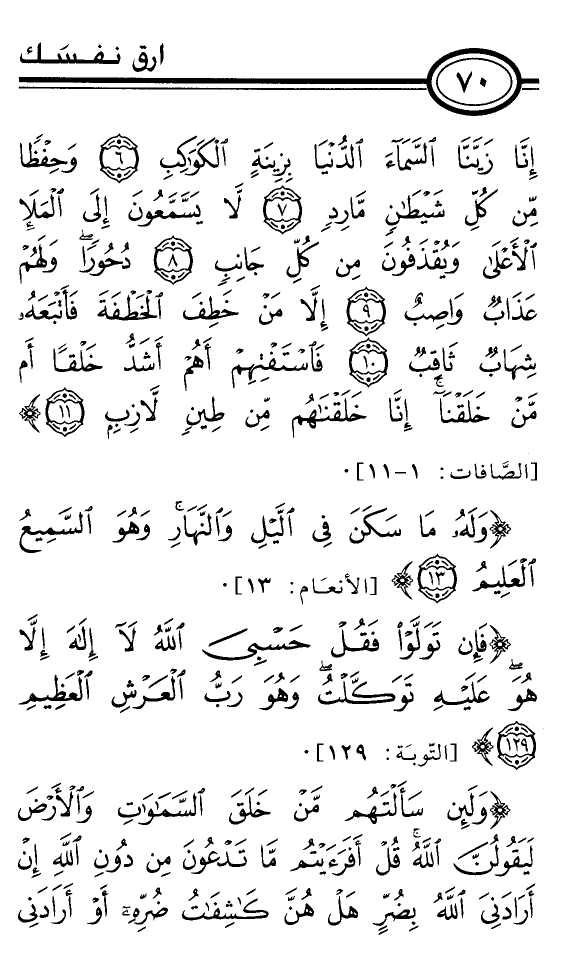 إِنَّا زَيَّنَّا السَّمَاءَ الدُّنْيَا بِزِينَةٍ الْكَوَاكِبِ *وَحِفْظًا مِنْ كُلِّ شَيْطَانٍ مَارِدٍ *لاَ يَسَّمَّعُونَ إِلَى الْمَلإَِ الأَعْلَى وَيُقْذَفُونَ مِنْ كُلِّ جَانِبٍ *دُحُورًا وَلَهُمْ عَذَابٌ وَاصِبٌ *إِلاَّ مَنْ خَطِفَ الْخَطْفَةَ فَأَتْبَعَهُ شِهَابٌ ثَاقِبٌ *فَاسْتَفْتِهِمْ أَهُمْ أَشَدُّ خَلْقًا أَمْ مَنْ خَلَقْنَا إِنَّا خَلَقْنَاهُمْ مِنْ طِينٍ لاَزِبٍ *} [الصَّافات: 1-11] .
