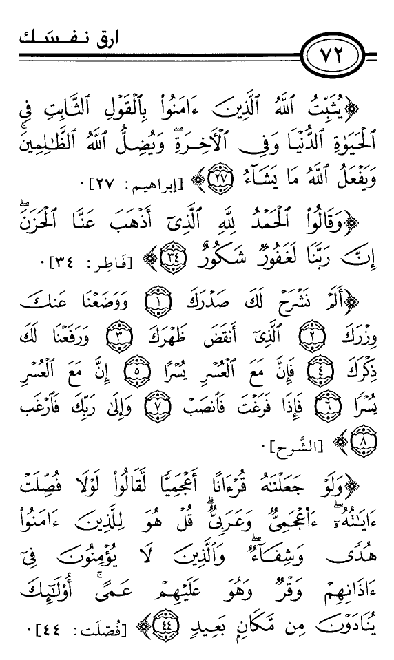 {أَلَمْ نَشْرَحْ لَكَ صَدْرَكَ *وَوَضَعْنَا عَنْكَ وِزْرَكَ *الَّذِي أَنْقَضَ ظَهْرَكَ *وَرَفَعْنَا لَكَ ذِكْرَكَ *فَإِنَّ مَعَ الْعُسْرِ يُسْرًا *إِنَّ مَعَ الْعُسْرِ يُسْرًا *فَإِذَا فَرَغْتَ فَانْصَبْ *وَإِلَى رَبِّكَ فَارْغَبْ *} [الشَّرح] .