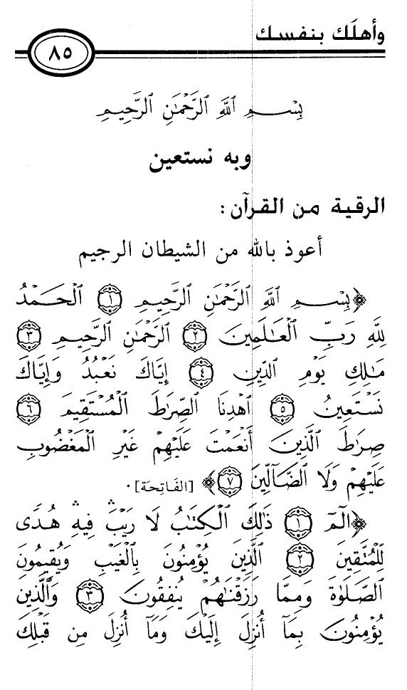 {بِسْمِ اللَّهِ الرَّحْمَانِ الرَّحِيمِ *الْحَمْدُ لِلَّهِ رَبِّ الْعَالَمِينَ *الرَّحْمَانِ الرَّحِيمِ *مَالِكِ يَوْمِ الدِّينِ *إِيَّاكَ نَعْبُدُ وَإِيَّاكَ نَسْتَعِينُ *اهْدِنَا الصِّرَاطَ الْمُسْتَقِيمَ *صِرَاطَ الَّذِينَ أَنْعَمْتَ عَلَيْهِمْ غَيْرِ الْمَغْضُوبِ عَلَيْهِمْ وَلاَ الضَّالِّينَ *} [الفَاتِحَة] .