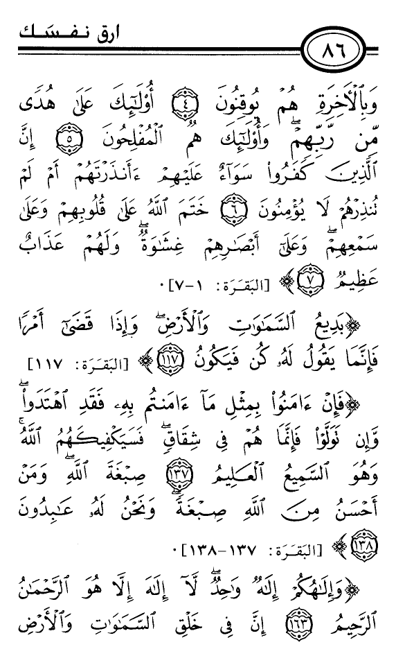 وَبِالآخِرَةِ هُمْ يُوقِنُونَ *أُولَئِكَ عَلَى هُدَىً مِنْ رَبِّهِمْ وَأُولَئِكَ هُمُ الْمُفْلِحُونَ *إِنَّ الَّذِينَ كَفَرُوا سَوَاءٌ عَلَيْهِمْ أَأَنْذَرْتَهُمْ أَمْ لَمْ تُنْذِرْهُمْ لاَ يُؤْمِنُونَ *خَتَمَ اللَّهُ عَلَى قُلُوبِهِمْ وَعَلَى سَمْعِهِمْ وَعَلَى أَبْصَارِهِمْ غِشَاوَةٌ وَلَهُمْ عَذَابٌ عَظِيمٌ *} [البَقَرَة: 1-7] .