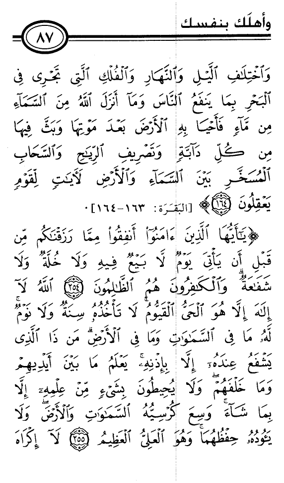 {يَاأَيُّهَا الَّذِينَ آمَنُوا أَنْفِقُوا مِمَّا رَزَقْنَاكُمْ مِنْ قَبْلِ أَنْ يَأْتِيَ يَوْمٌ لاَ بَيْعٌ فِيهِ وَلاَ خُلَّةٌ وَلاَ شَفَاعَةٌ وَالْكَافِرُونَ هُمُ الظَّالِمُونَ *اللَّهُ لاَ إِلَهَ إِلاَّ هُوَ الْحَيُّ الْقَيُّومُ لاَ تَأْخُذُهُ سِنَةٌ وَلاَ نَوْمٌ لَهُ مَا فِي السَّمَاوَاتِ وَمَا فِي الأَرْضِ مَنْ ذَا الَّذِي يَشْفَعُ عِنْدَهُ إِلاَّ بِإِذْنِهِ يَعْلَمُ مَا بَيْنَ أَيْدِيهِمْ وَمَا خَلْفَهُمْ وَلاَ يُحِيطُونَ بِشَيءٍ مِنْ عِلْمِهِ إِلاَّ بِمَا شَاءَ وَسِعَ كُرْسِيُّهُ السَّمَاوَاتِ وَالأَرْضَ وَلاَ يَؤُودُهُ حِفْظُهُمَا وَهُوَ الْعَلِيُّ الْعَظِيمُ *لاَ إِكْرَاهَ