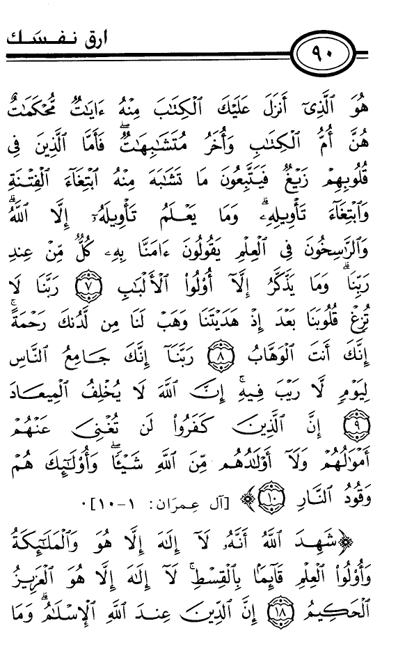 هُوَ الَّذِي أَنْزَلَ عَلَيْكَ الْكِتَابَ مِنْهُ آيَاتٌ مُحْكَمَاتٌ هُنَّ أُمُّ الْكِتَابِ وَأُخَرُ مُتَشَابِهَاتٌ فَأَمَّا الَّذِينَ فِي قُلُوبِهِمْ زَيْغٌ فَيَتَّبِعُونَ مَا تَشَابَهَ مِنْهُ ابْتِغَاءَ الْفِتْنَةِ وَابْتِغَاءَ تَأْوِيلِهِ وَمَا يَعْلَمُ تَأْوِيلَهُ إِلاَّ اللَّهُ وَالرَّاسِخُونَ فِي الْعِلْمِ يَقُولُونَ آمَنَّا بِهِ كُلٌّ مِنْ عِنْدِ رَبِّنَا وَمَا يَذَّكَّرُ إِلاَّ أُولُو الأَلْبَابِ *رَبَّنَا لاَ تُزِغْ قُلُوبَنَا بَعْدَ إِذْ هَدَيْتَنَا وَهَبْ لَنَا مِنْ لَدُنْكَ رَحْمَةً إِنَّكَ أَنْتَ الْوَهَّابُ *رَبَّنَا إِنَّكَ جَامِعُ النَّاسِ لِيَوْمٍ لاَ رَيْبَ فِيهِ إِنَّ اللَّهَ لاَ يُخْلِفُ الْمِيعَادَ *إِنَّ الَّذِينَ كَفَرُوا لَنْ تُغْنِيَ عَنْهُمْ أَمْوَالُهُمْ وَلاَ أَوْلاَدُهُمْ مِنَ اللَّهِ شَيْئًا وَأُولَئِكَ هُمْ وَقُودُ النَّارِ *} [آل عِمرَان: 1-10] .