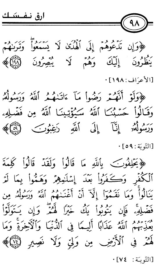 {وَلَوْ أَنَّهُمْ رَضُوا مَا آتَاهُمُ اللَّهُ وَرَسُولُهُ وَقَالُوا حَسْبُنَا اللَّهُ سَيُؤْتِينَا اللَّهُ مِنْ فَضْلِهِ وَرَسُولُهُ إِنَّا إِلَى اللَّهِ رَاغِبُونَ *} [التّوبَة:59] .