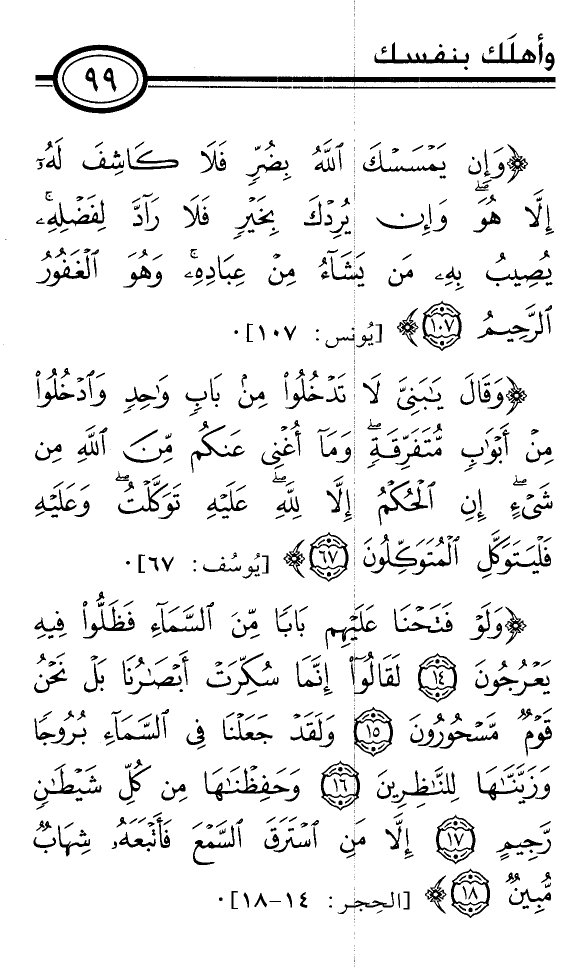 {وَقَال يابَنِيَّ لاَ تَدْخُلُوا مِنْ بَابٍ وَاحِدٍ وَادْخُلُوا مِنْ أَبْوَابٍ مُتَفَرِّقَةٍ وَمَا أُغْنِي عَنْكُمْ مِنَ اللَّهِ مِنْ شَيْءٍ إِنِ الْحُكْمُ إِلاَّ لِلَّهِ عَلَيْهِ تَوَكَّلْتُ وَعَلَيْهِ فَلْيَتَوَكَّلِ الْمُتَوَكِّلُونَ *} [يُوسُف: 67] .