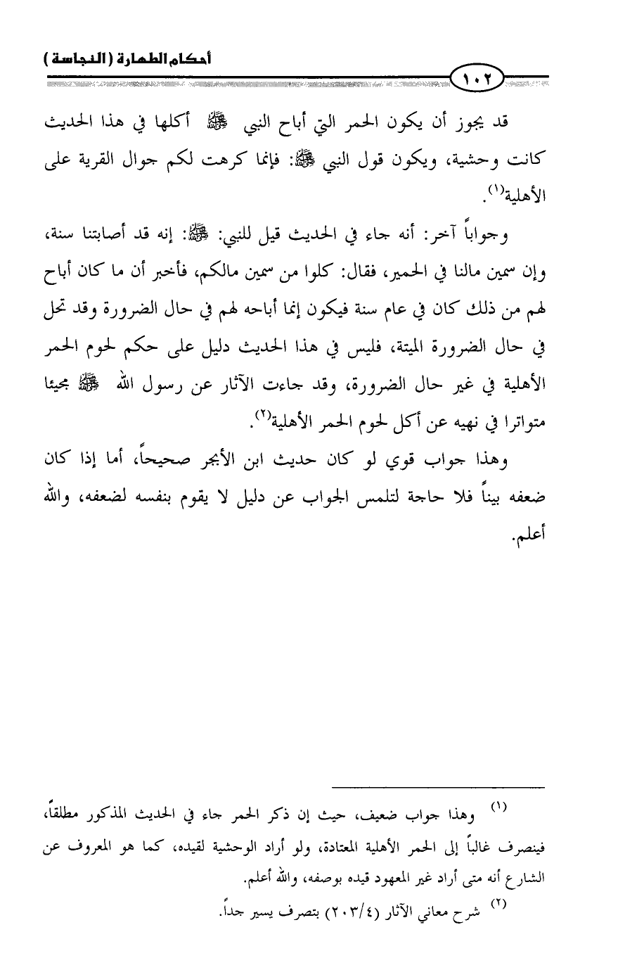 (¬١) وهذا جواب ضعيف، حيث إن ذكر الحمر جاء في الحديث المذكور مطلقاً، فينصرف غالباً إلى الحمر الأهلية المعتادة، ولو أراد الوحشية لقيده، كما هو المعروف عن الشارع أنه متى أراد غير المعهود قيده بوصفه، والله أعلم.